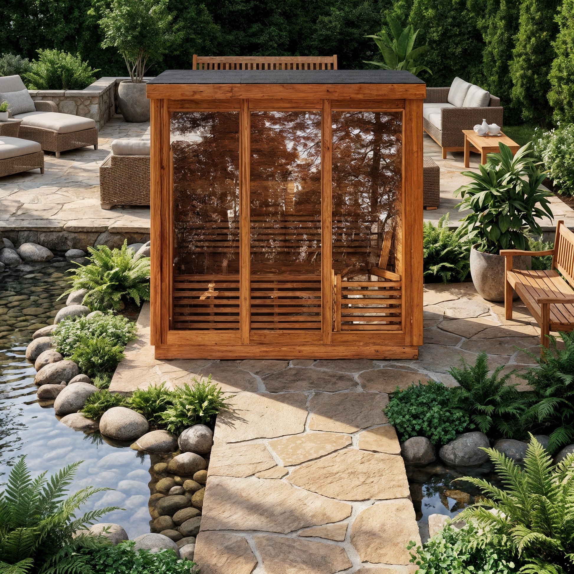 Modern Box Design: Sleek, contemporary sauna featuring three large front glass panels and a side-entry door for easy access and an open, modern feel.